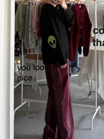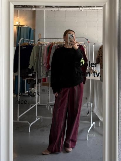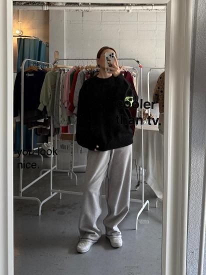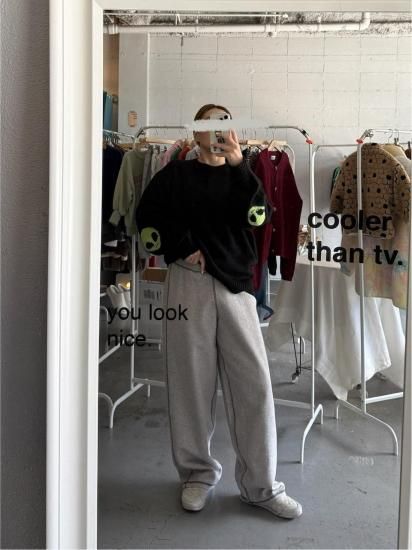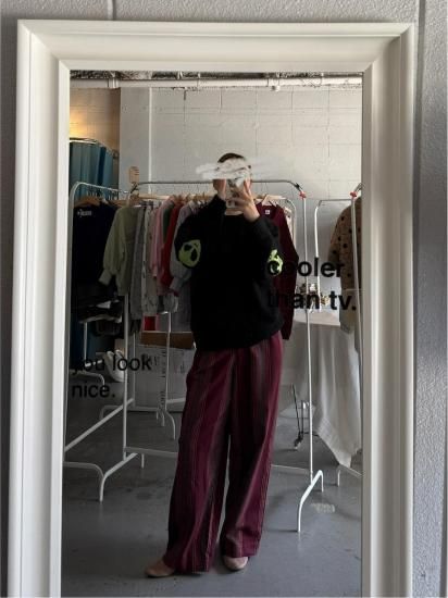 *店内の着画は身長160cm、バーガンディのストライプパンツと158/164サイズ、グレーのスウェットパンツと170/176サイズを着ています。