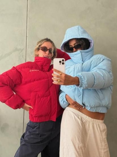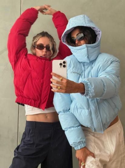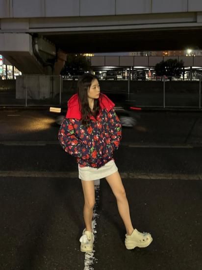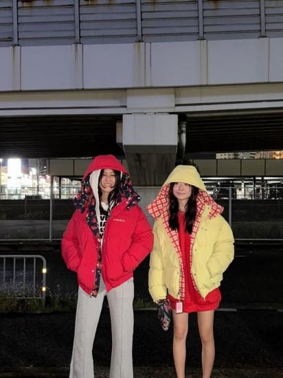 夜の屋外の着用画像は身長154cm、165cmで、どちらもXS/Sを着て撮影しています